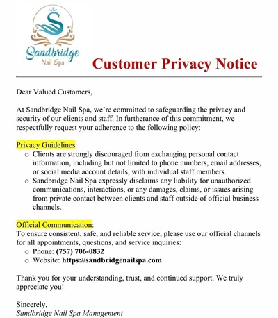 SANDRIDGE NAIL SPA is voted to be the top and the best NAIL SALON in Virginia Beach, VA 23456. Finding a top quality nail salon can be difficult. Many people ask friends and neighbors for referrals or even complete strangers, if the nail design is unique and shows the excellence of the nail designer. If you think about it for a bit, that nail art you are wearing is the signature of the nail technician. At our nail salon, we pride ourselves in the excellence of our work. We offer complete satisfaction with the attention to details that can make the difference in a design. Our services are art to us and we have our customers to thank for that. You are our number one priority and we deliver exceptional service in a clean environment. All of our products are top quality, name brands that you come to expect. All equipment is thoroughly cleaned and sanitized after each use for your health and safety. We want you to have a safe and professional experience while visiting our salon. Our nail technicians are licensed and certified in all of the applications you expect from a quality nail salon. Choose from any of the popular services we offer such as manicures, pedicures, nail art with air brushing and jewels, French manicures, pink and white, acrylics, no chip gels, hand dips and more. See our service page for the complete list. Come in for your spa day and let us spoil you while you relax and unwind in our quiet and comfortable atmosphere. We know you pride yourself in beautiful nails and we can help you achieve the look you desire with our highly trained nail professionals. Call us 757-706-0832 today or send text message or use our easy online booking system to set your appointment. We look forward to serving you.